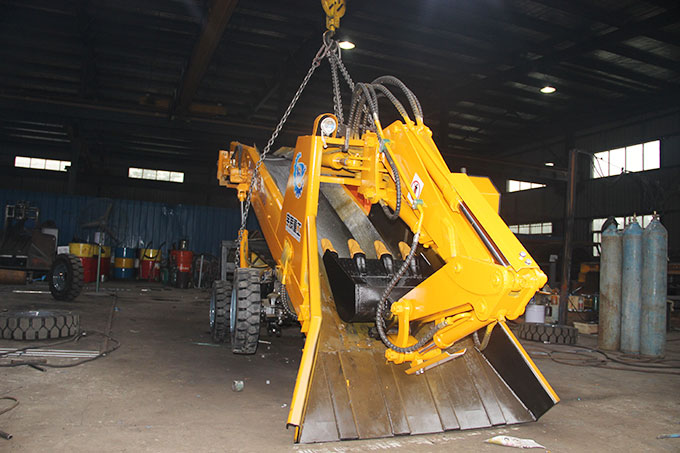 小型轮胎式挖掘装载机(小型扒渣机)是一种连续生产的出矿设备。主要用于空间狭窄的洞采作业,如金属矿,引水巷道等,其作用是采集各工程的碎石土料并输送、装车。本机靠轮胎推进铲取岩石并通过铲斗将石料扒进自身的皮带输送机,输送机从尾部将岩石卸入自卸车、矿车。同时也可利用反铲挖掘臂扒取远处的岩石,也可以用铲斗来清理工作面。适用于断面为2.0米内(1.8*1.8米)的巷道。